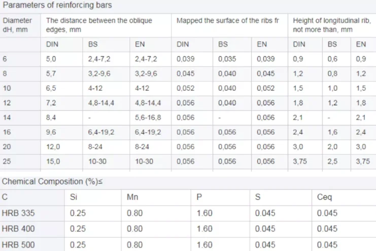 GB:HRB400 HRB400E HRB500USA:ASTM A615 GR40,GR60UK: BS4449 GR460