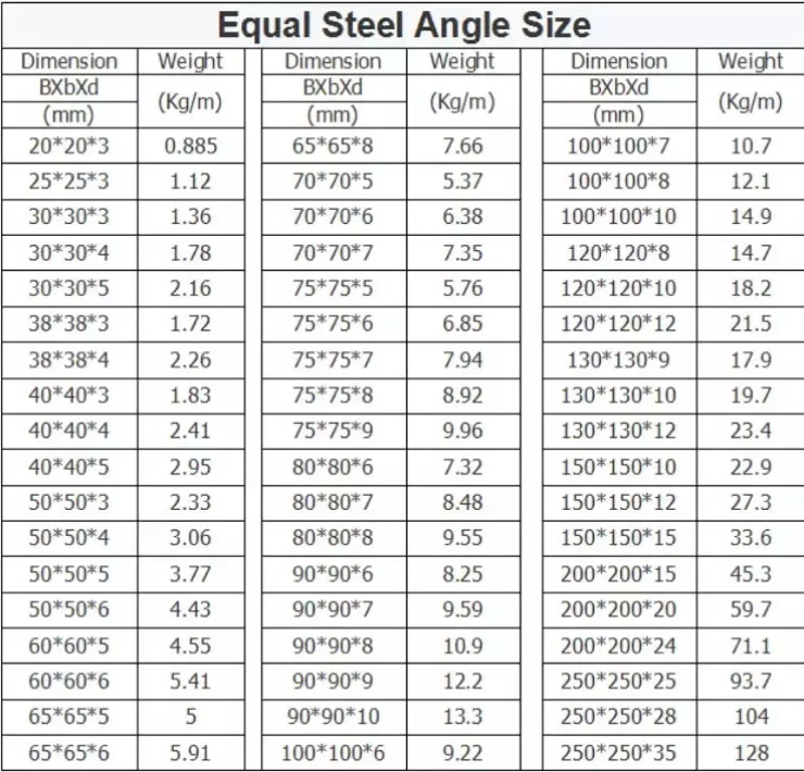 The theoretical weight calculation formula of angle steel: meter weight (kg) = (side length mm + side length – side thickness) * side thickness mm * 0.00785. Such as 63*63*5 angle steel, meter weight = (63+63-5)*5*0.00785=4.749kg
